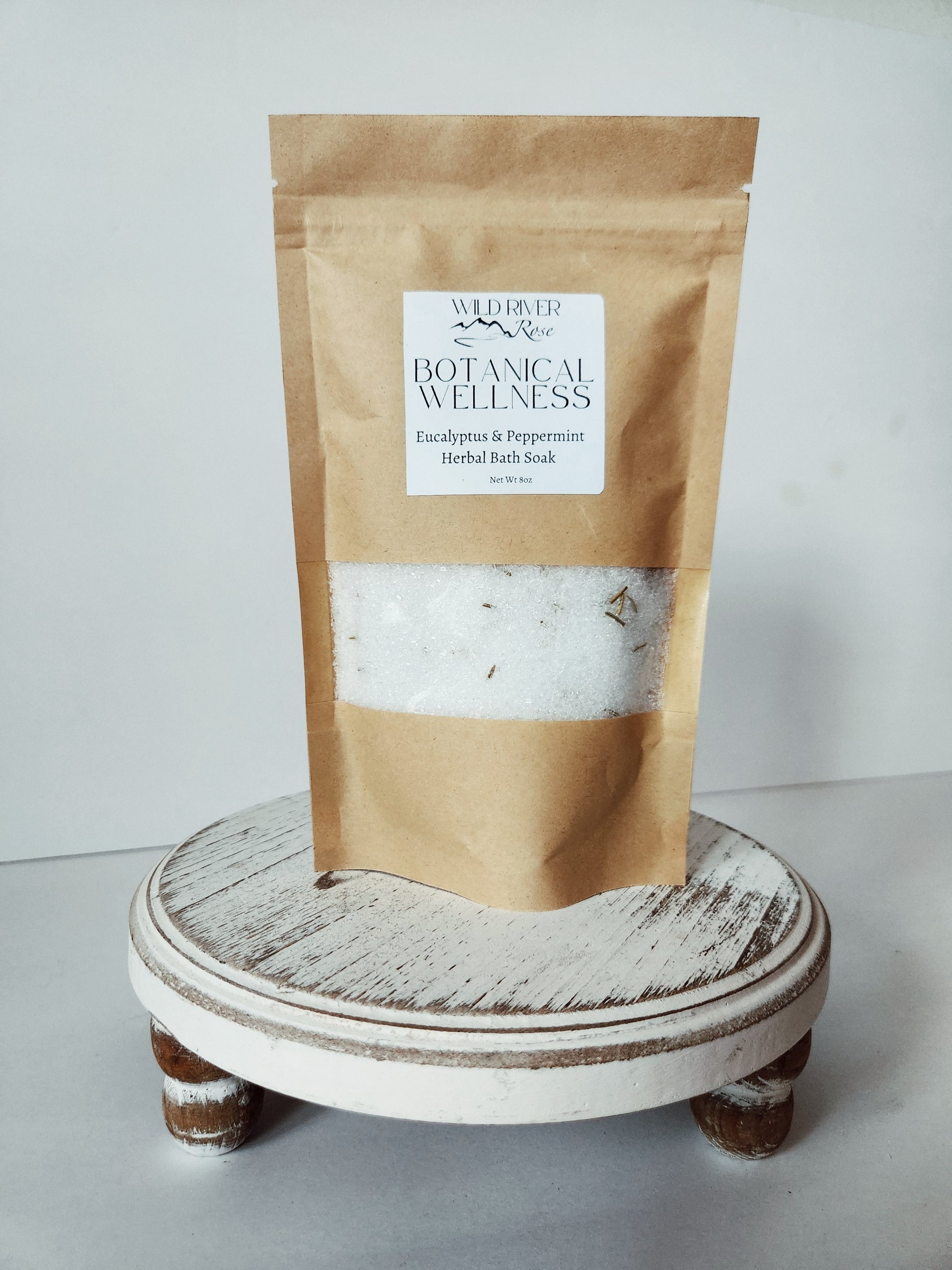 Herbal bath salts combine the therapeutic benefits of Dead Sea salt, magnesium chloride flakes, and Epsom salts (magnesium sulfate) with the revitalizing properties of eucalyptus, and rosemary essential oils, with added dried botanicals.