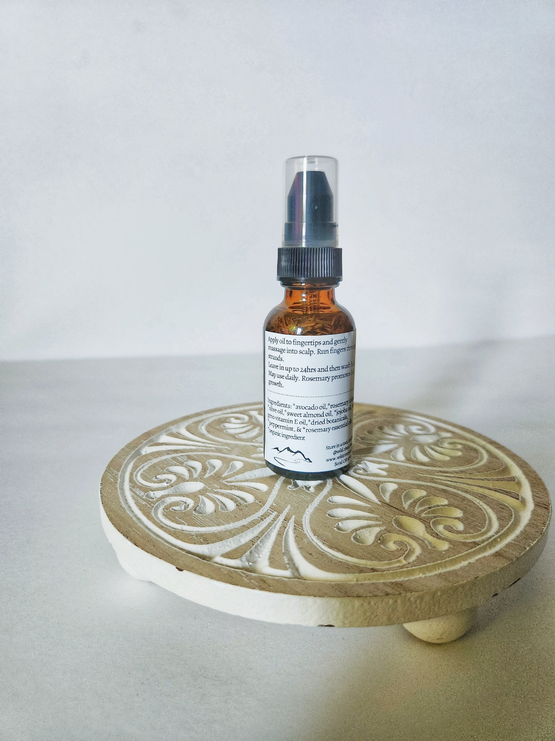 Ingredients: *avocado oil, *rosemary infused *olive oil,*sweet almond oil, *jojoba oil, *castor oil, non-gmo vitamin E oil, *dried botanicals, *peppermint, & *rosemary essential oils