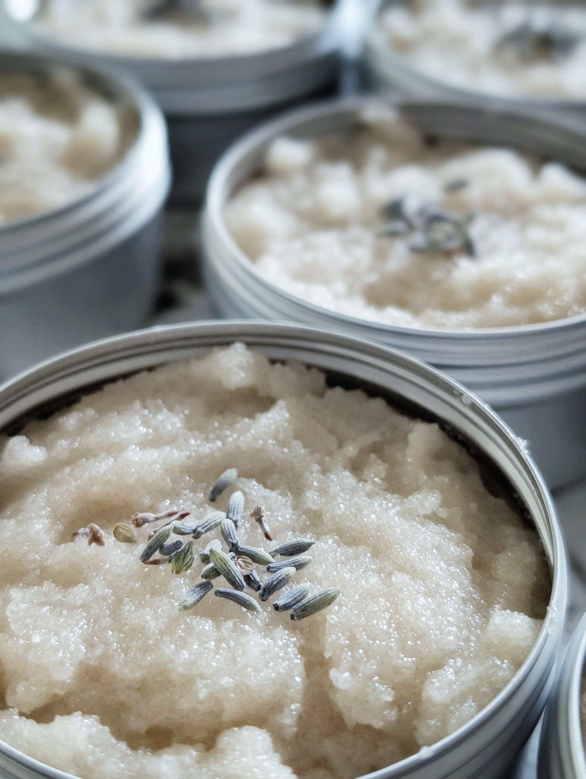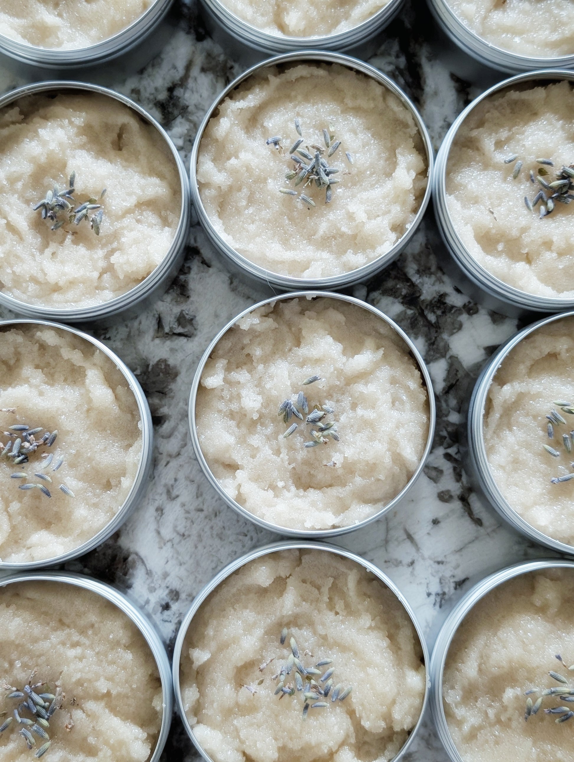 Lavender Love: *cane sugar, *coconut oil, vitamin E oil, lavender castile soap, lavender essential oil, & dried *lavender flowers